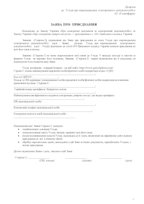 1. Приєднання відбувається шляхом заповнення, підписання та подання Заяви про приєднання за формою, наведеною у додатку до цієї Угоди або за посилання: